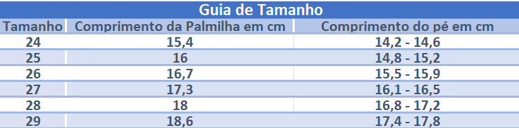• Guia de tamanho para calçado com tamanhos, comprimentos da palmilha e do pé em cm
