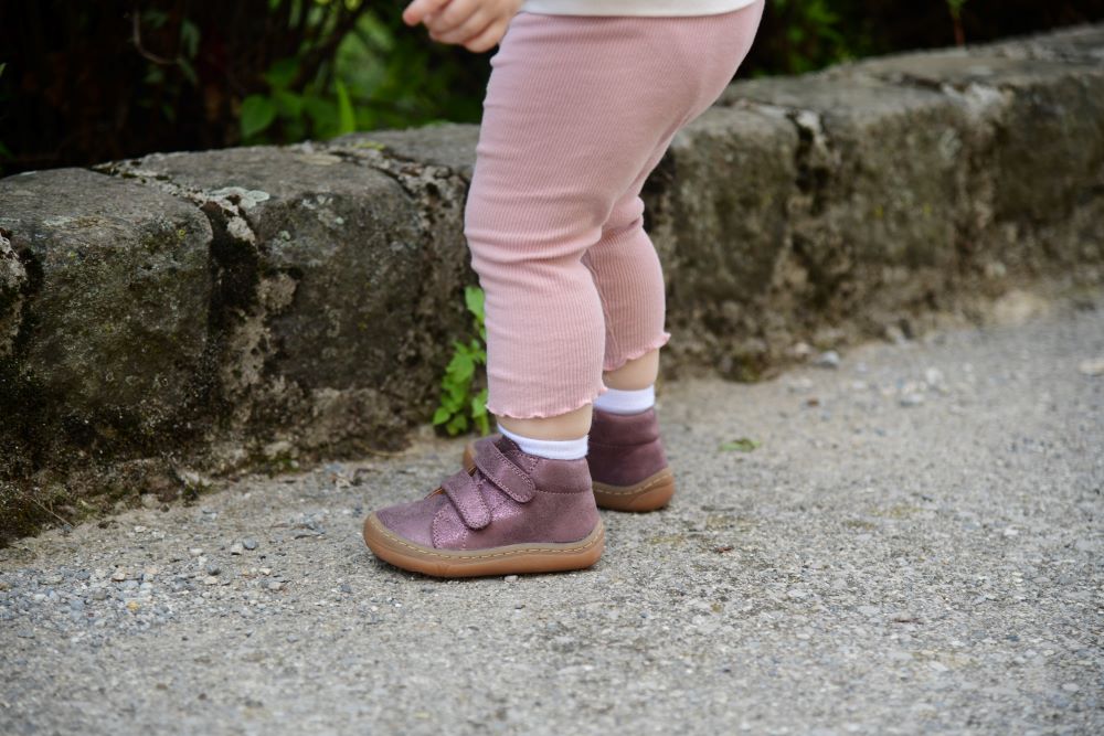 Bota infantil rosa metálica com fecho de velcro e sola castanha