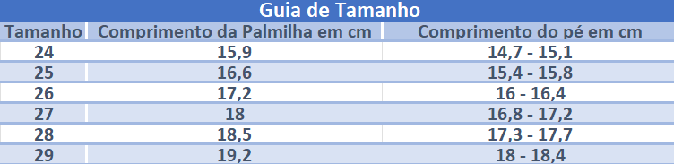 • Tabela de guia de tamanho para calçado com medidas em centímetros