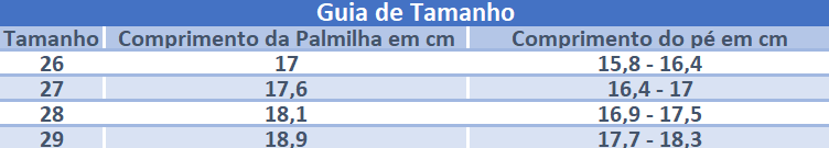 • Tabela de guia de tamanho com medidas em cm para palmilha e pé