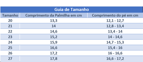 • Tabela de guia de tamanho com tamanhos de 20 a 27 e medidas correspondentes em centímetros.