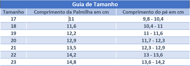 • Tabela de guia de tamanhos de calçado com medidas em centímetros.