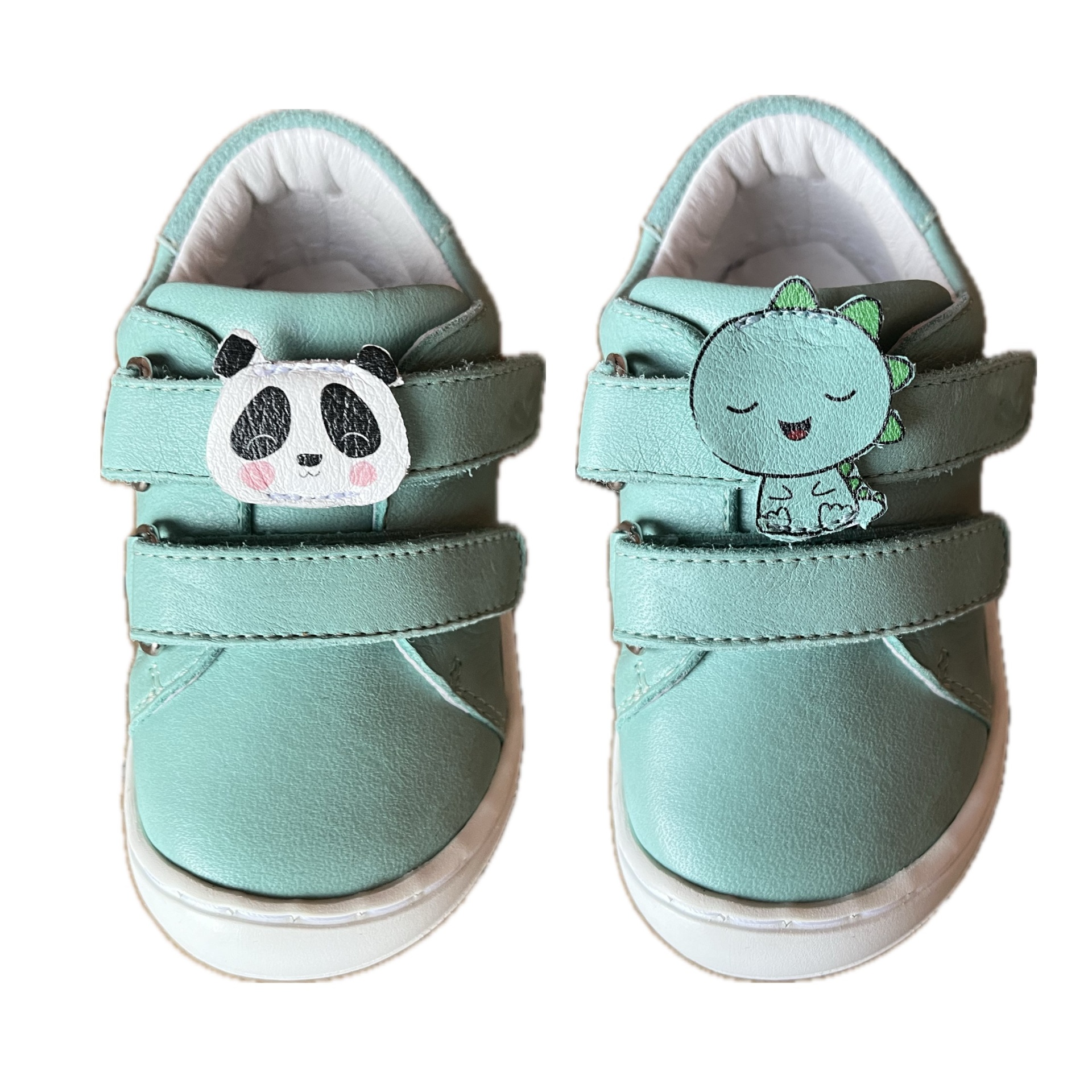 Sapatilha verde em pele macia, com ponteira ampla, sola dura, fina (3,5 mm), flexível e sem desnível, e palmilha lisa.
