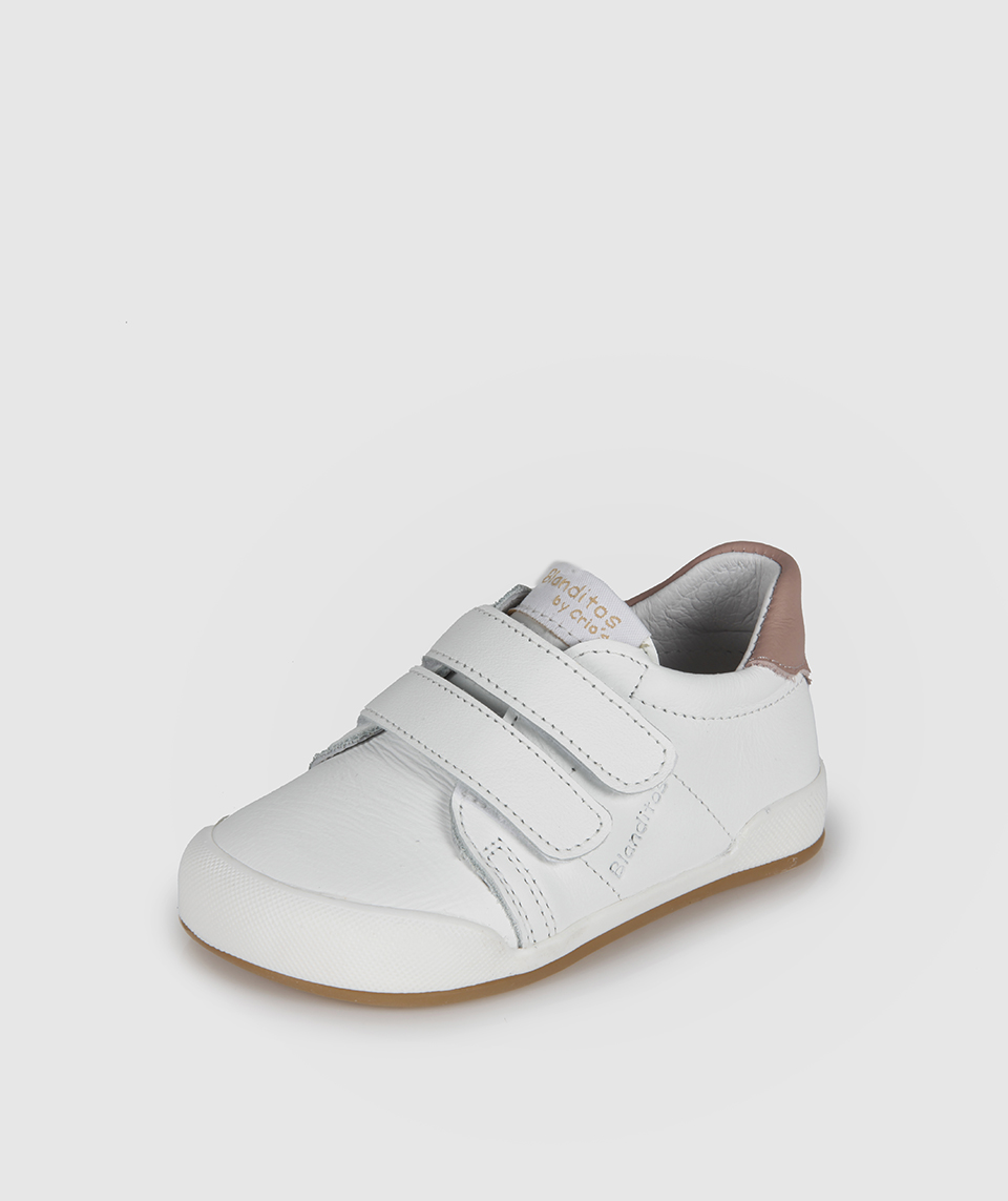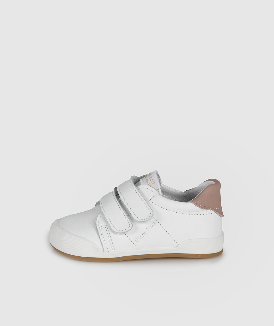 • Sapatilha branca para criança com tiras de velcro e detalhe rosa claro no calcanhar